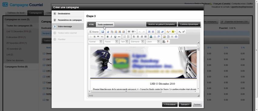 - Mise en page du message à partir d'un de nos nombreux gabarits gratuits, ou à partir de votre propre modèle HTML.